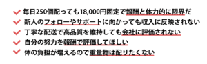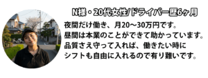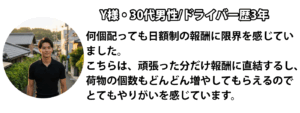 〇品質の高いドライバーは、希望エリア・シフト優先 ・配送品質 ・シフト貢献 ・安全運転 ・協調性これらを総合的に評価し、優良ドライバー様には、 一般ドライバー様よりも希望エリア・シフトを 最優的に確保します。